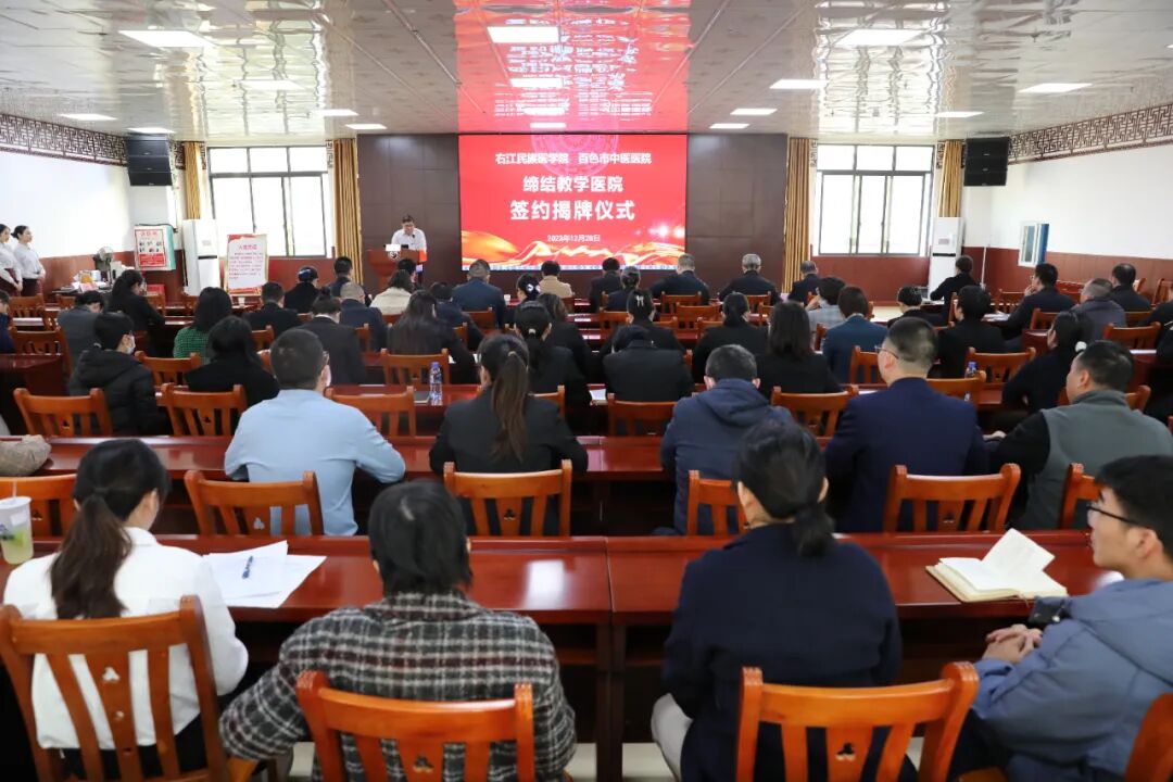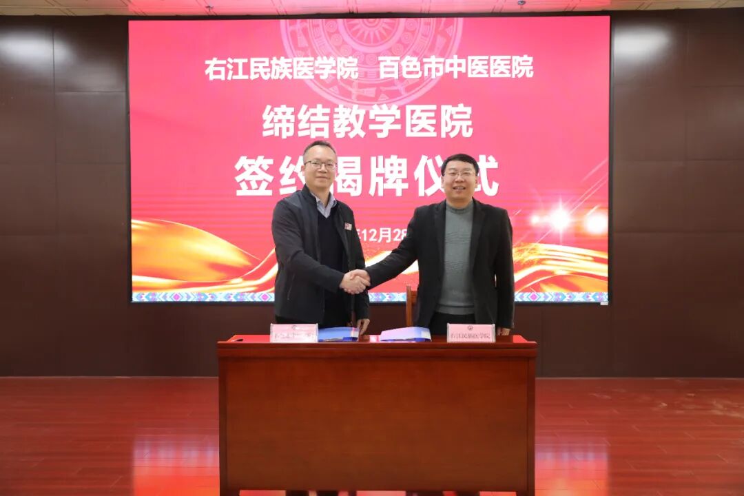 活动上,华树良院长代表医院与王俊利副校长签署了《缔结教学医院协议》,百色市卫健委、学校及医院相关领导共同为教学医院揭牌。